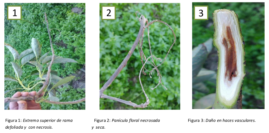 La enfermedad comienza por los extremos de las ramas, en los ápices, secando las panículas florales y las hojas terminales. La necrosis de las ramas (tejido ennegrecido y muerto) va avanzando de forma progresiva y en sentido descendente. Al mismo tiempo, en su interior, los haces vasculares toman un color rojizo que se intensifica conforme se profundiza en el tallo y que finalmente acaba necrosando también los tejidos más internos de la rama por completo. Por otro lado, se suelen producir chancros, heridas producidas por hongos en las que la corteza del árbol se encuentra ennegrecida y resquebrajada.