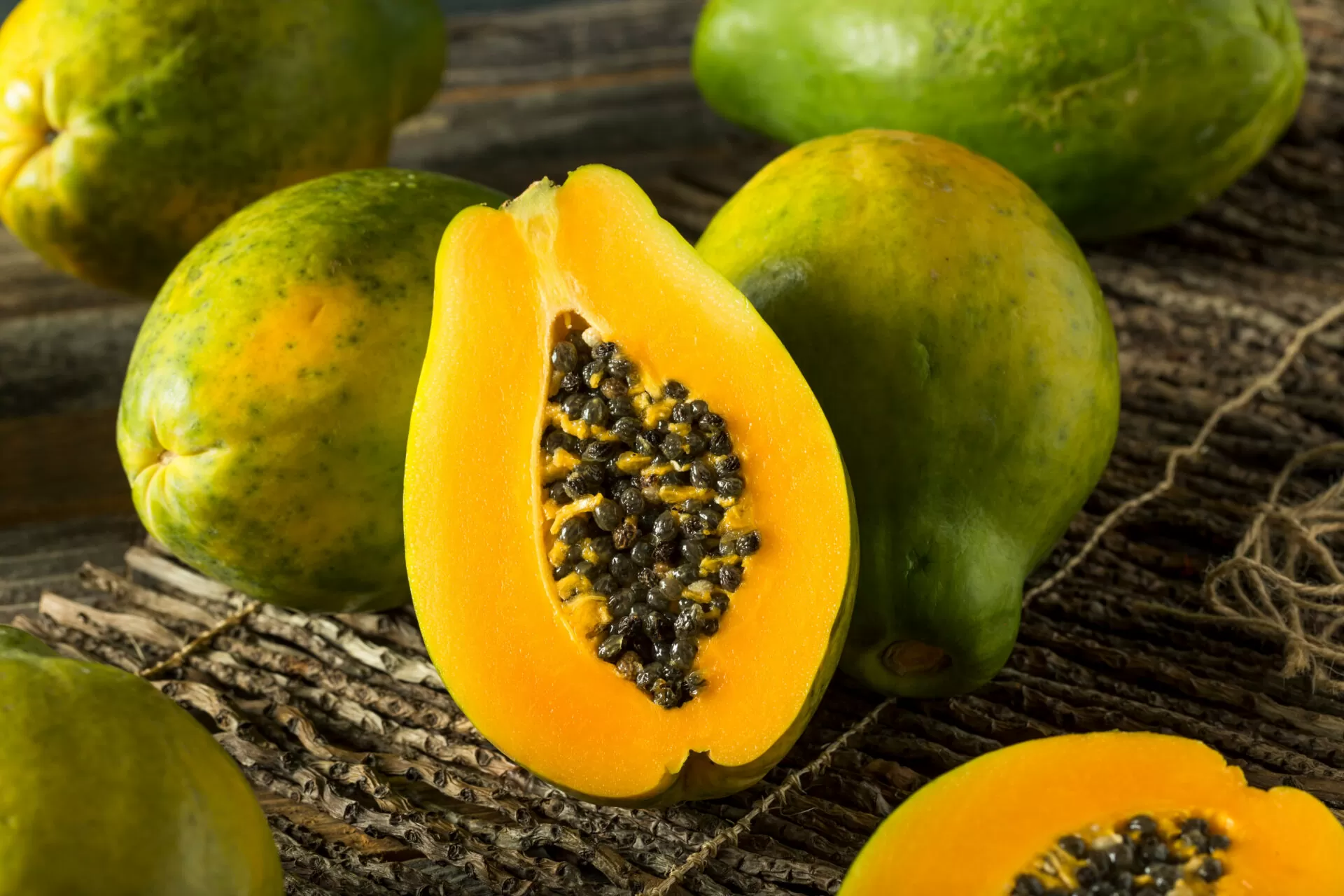 Las hojas de la papaya son grandes y lobuladas. Sus flores pueden ser masculinas, femeninas o hermafroditas, y crecen en racimos. El fruto es grande, ovalado, con una piel que cambia de verde a naranja cuando madura, y tiene una pulpa dulce y jugosa llena de semillas negras.