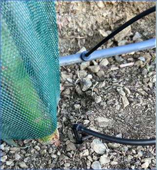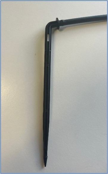 El gotero se debe colocar a unos 4 cm del tronco aproximadamente. De esta forma nos aseguraremos de que, tras trasplantar la planta a campo, las raíces concentradas en el cepellón se hidratarán bien y localizaremos el agua exactamente donde es demandada evitando un gran estrés a la planta. A continuación, se muestra un gotero ya colocado en campo.